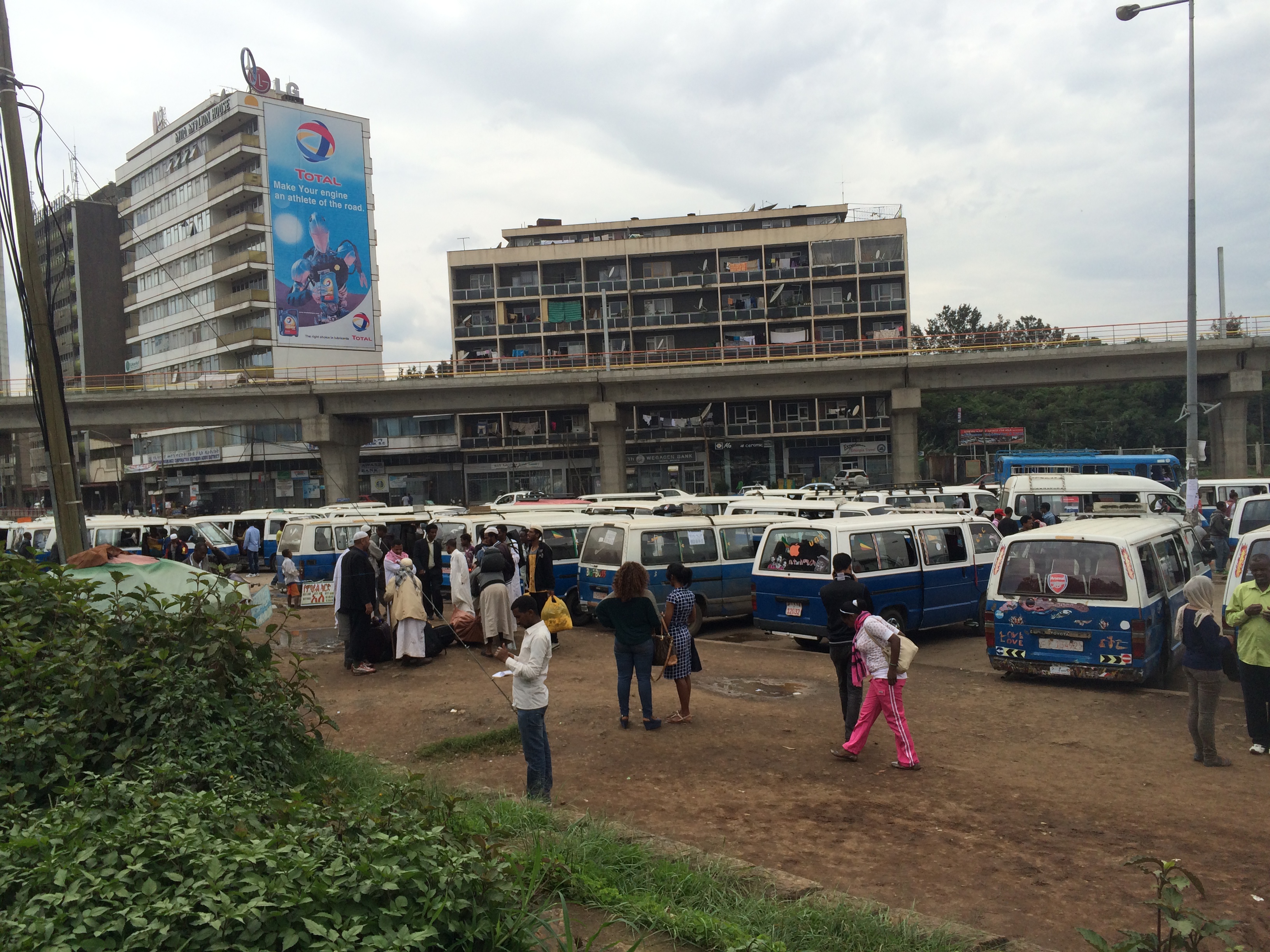 To get around, I used the public transportation system of minibuses, 12 passenger vans that drove along a fixed route. A teenage boy rode along calling out the destination and collecting payment. Each ride cost about 15-20 cents. From my hotel to get into the city, I had to walk to a place called Mexico then take the minibus. I struggled a lot to figure out the system because the minibuses did have the destination written on the front of the bus, but it is written in Amharic, a written script unique to Ethiopia. The minibuses did have designated stops, but they were simply unmarked parts of the street. Additionally, very few people spoke English here so it sometimes took up to 10 minutes of pantomiming to figure out where I needed to stand to catch the right minibus line.