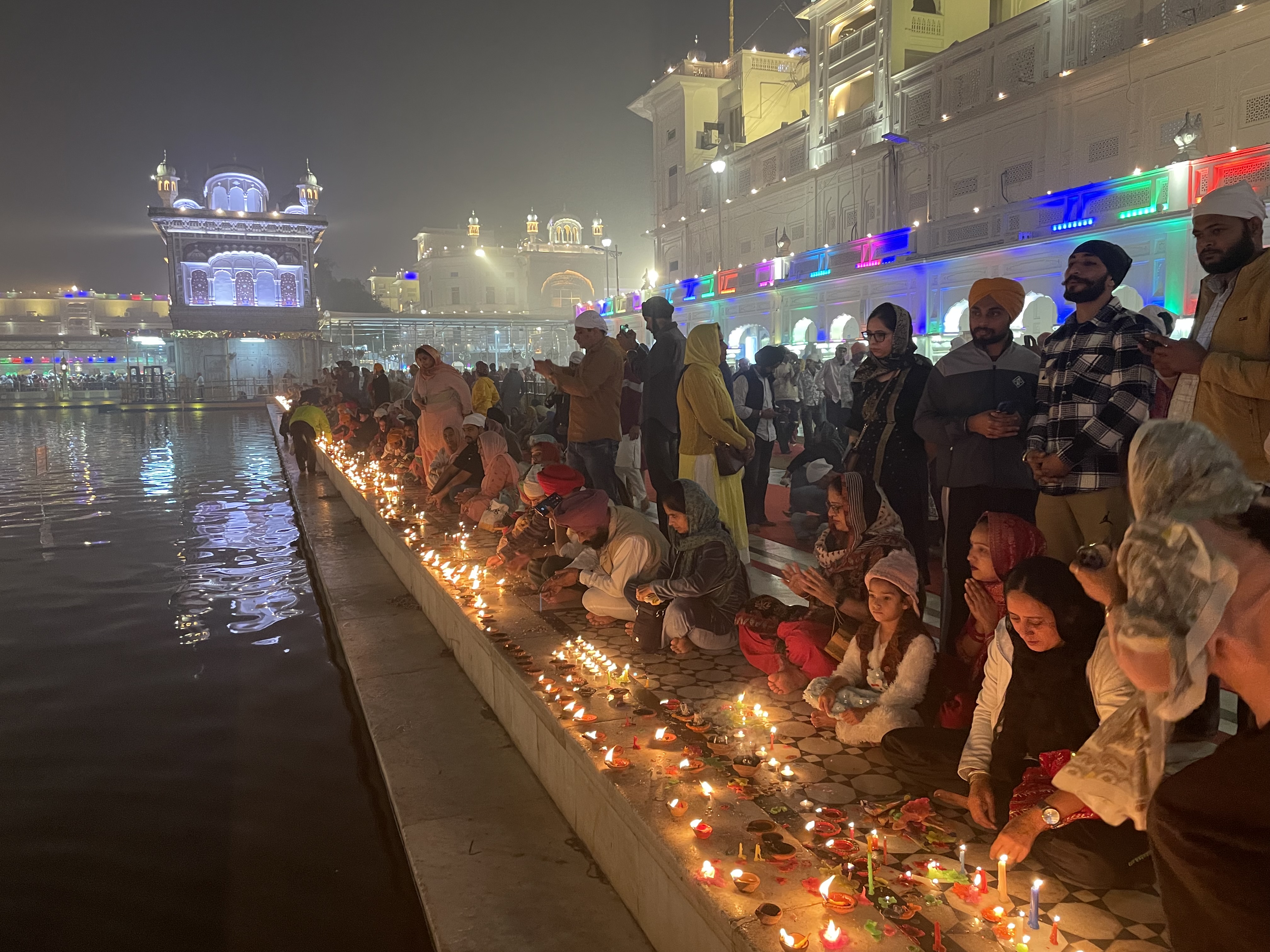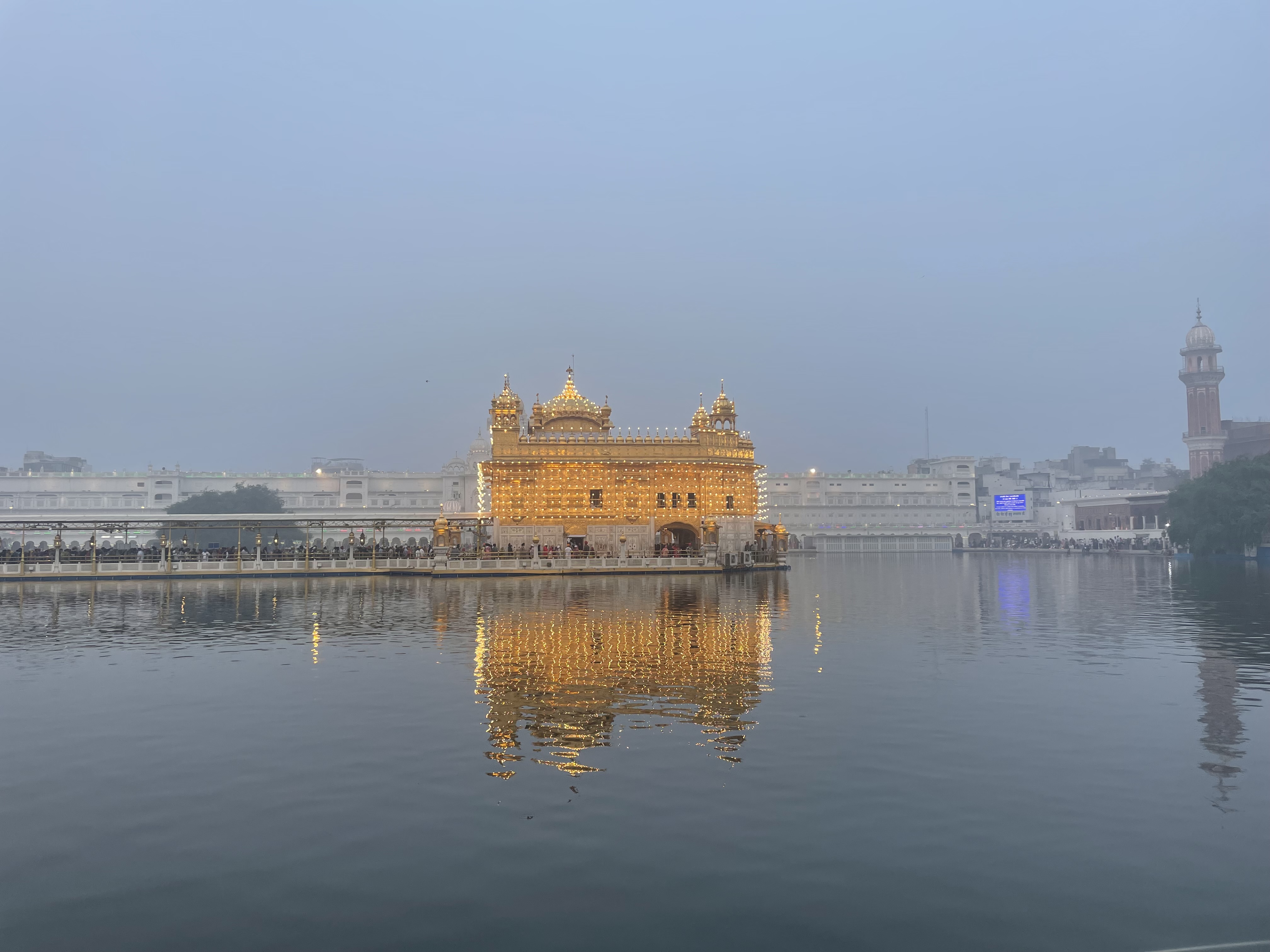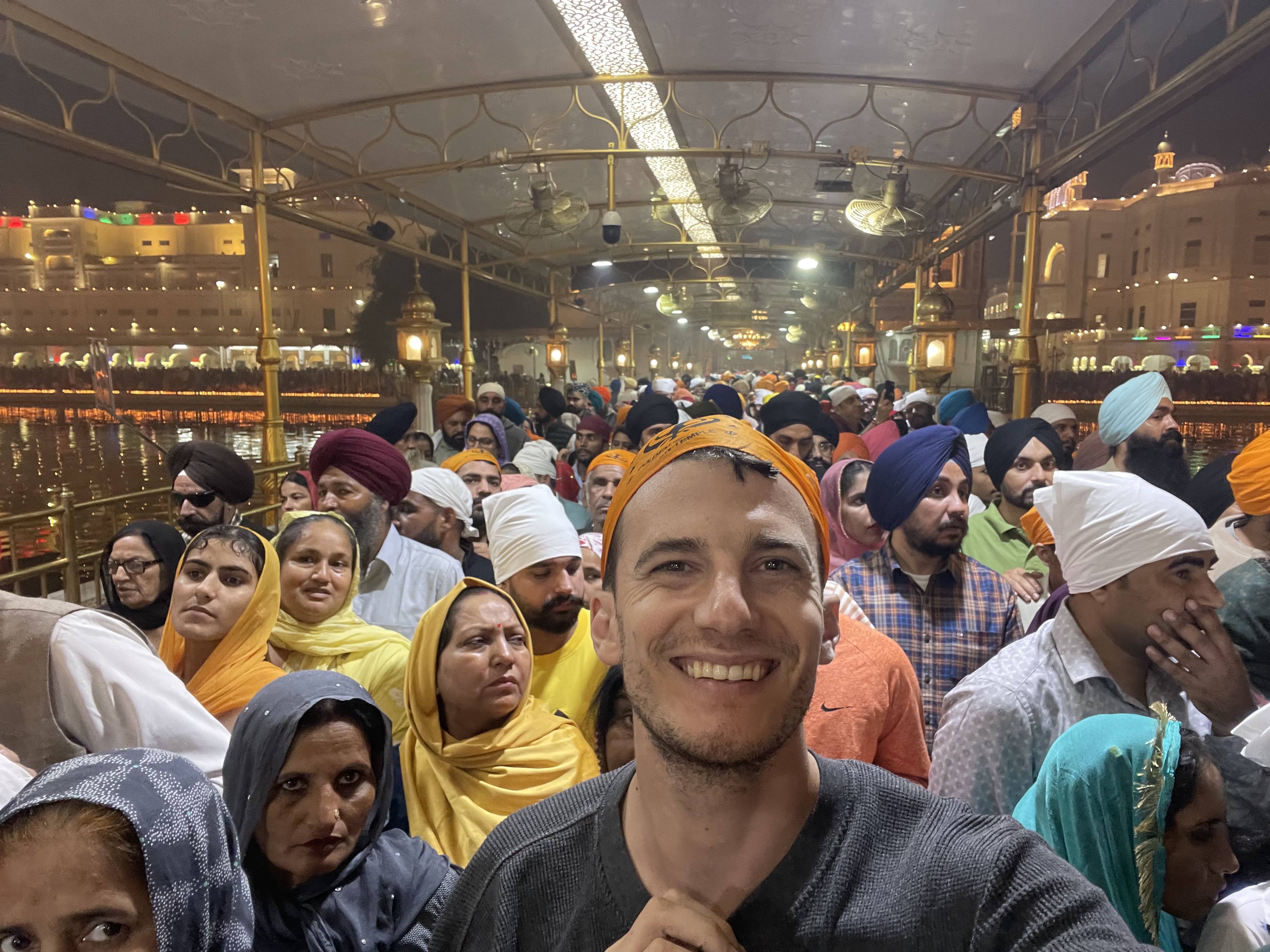After wandering around the sacred lake and seeing the thousands of pilgrims, the sun began to set, and strings of lights appeared on the Golden Temple. I was told this was for the holiday. I also entered a line to get food and ended up with a sweet cornmeal mash. I took a few bites before going to a line to throw it out. The volunteers were horrified and shooed me away. I later learned that I had broken two rules. First, having leftovers is not allowed in the Sikh religion and second, the line I had entered was actually to donate food to God. So, my actions connotated that I was going to donate leftovers to God which is a huge insult. Luckily, an English-speaking Sikh man explained this to me and I quickly and profusely apologized.
