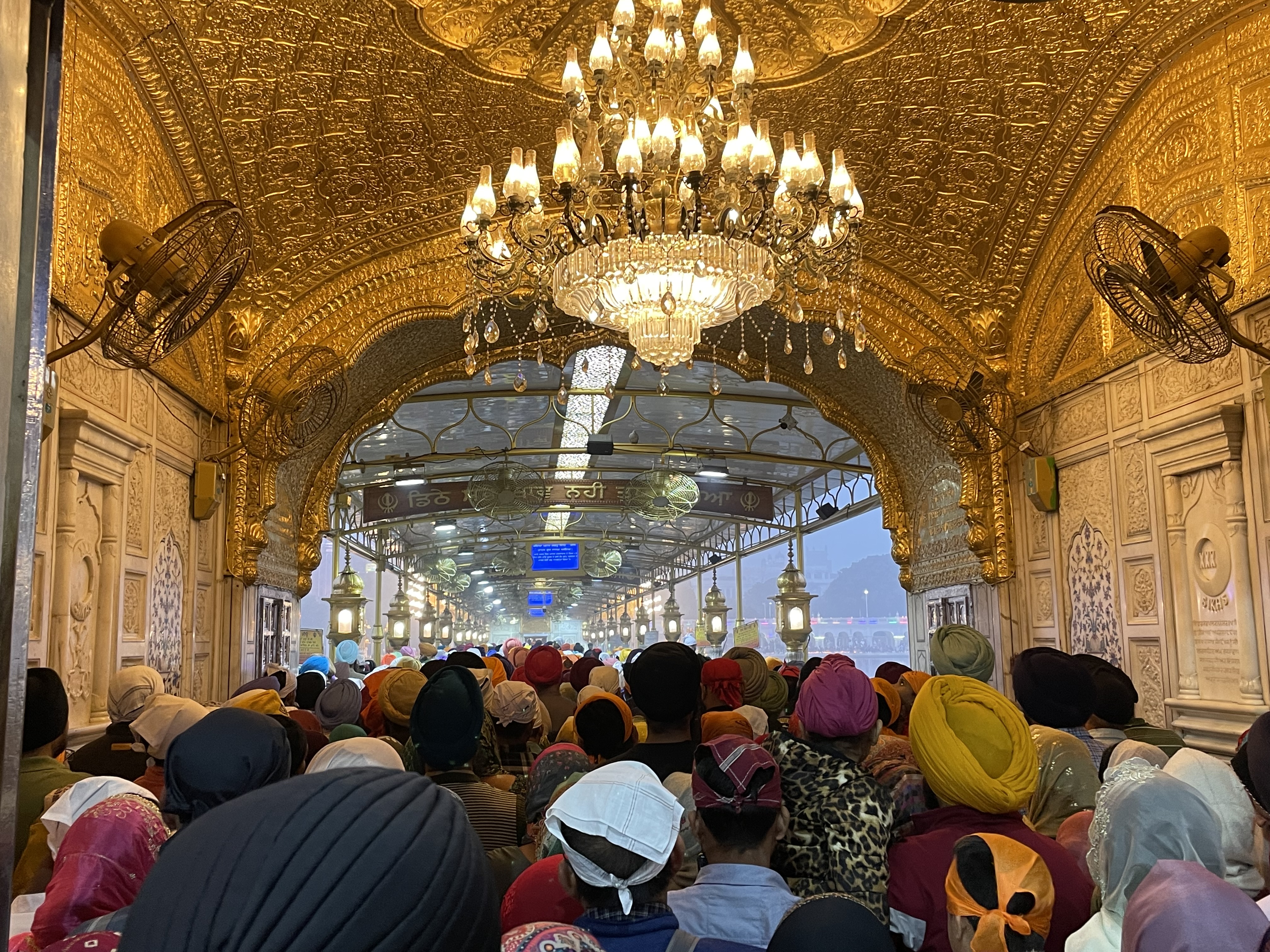 The inside of the Golden Temple is covered in… gold. The main room at the center contains THE book which was being read by a turbaned Sikh leader. Accompanying him was a band of five musicians. Pilgrims were crowding to the front to donate money.
