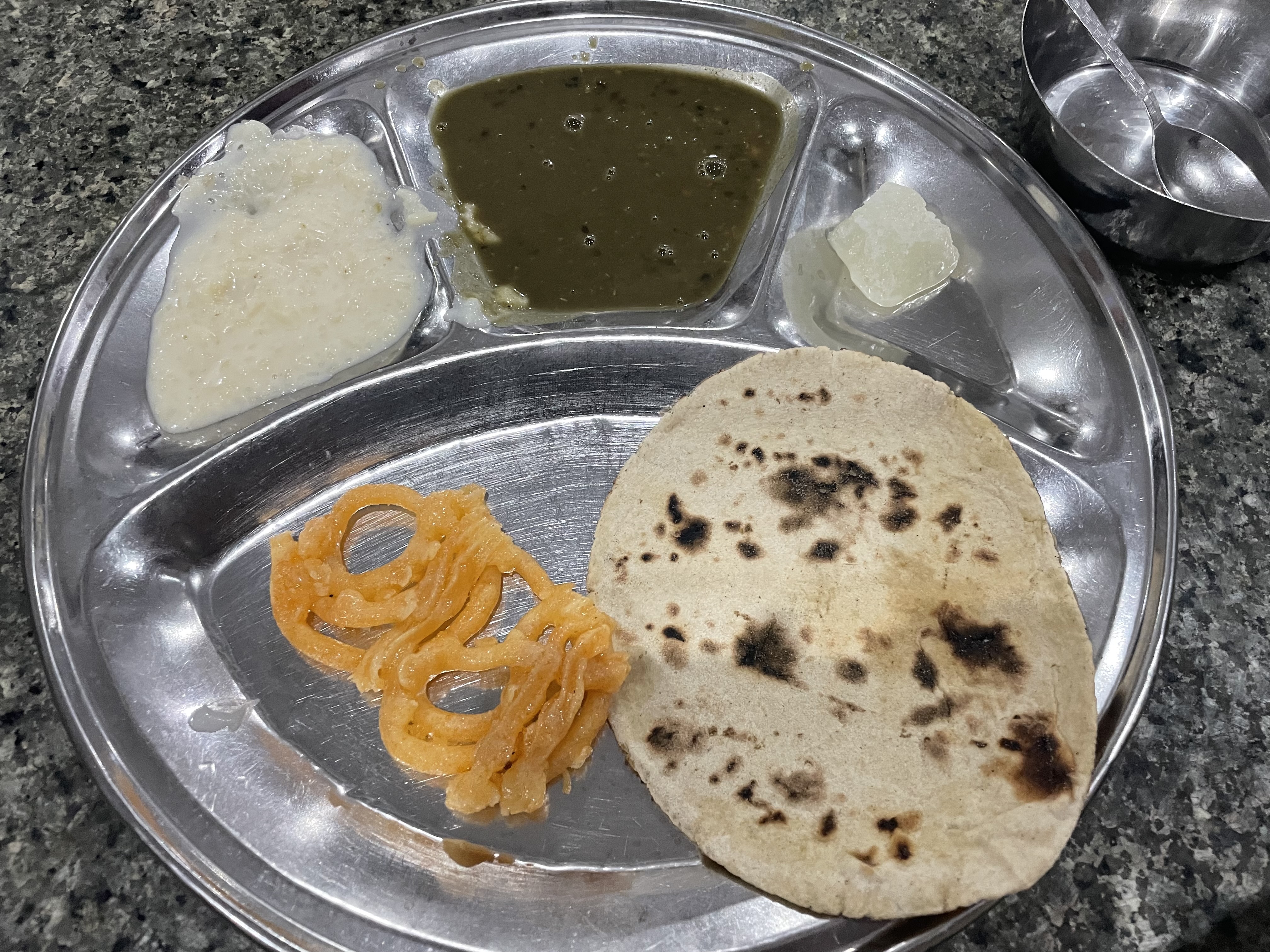 After entering, I was given a metal plate and cup. I then headed up a series of stairs into another crowd. Eventually we were let into the dining room. To eat, everybody sat on the floor. Volunteers scooped food onto our plates. The vegetarian meal included a piece of chapati, a green curry, a white sweet dish called kheer, a piece of gummy-sugar and a jalebi sweet. So, it was mostly sweet items. They also give you water to drink. You can get unlimited refills, but due to the Sikh wariness of leftovers, I played it safe.