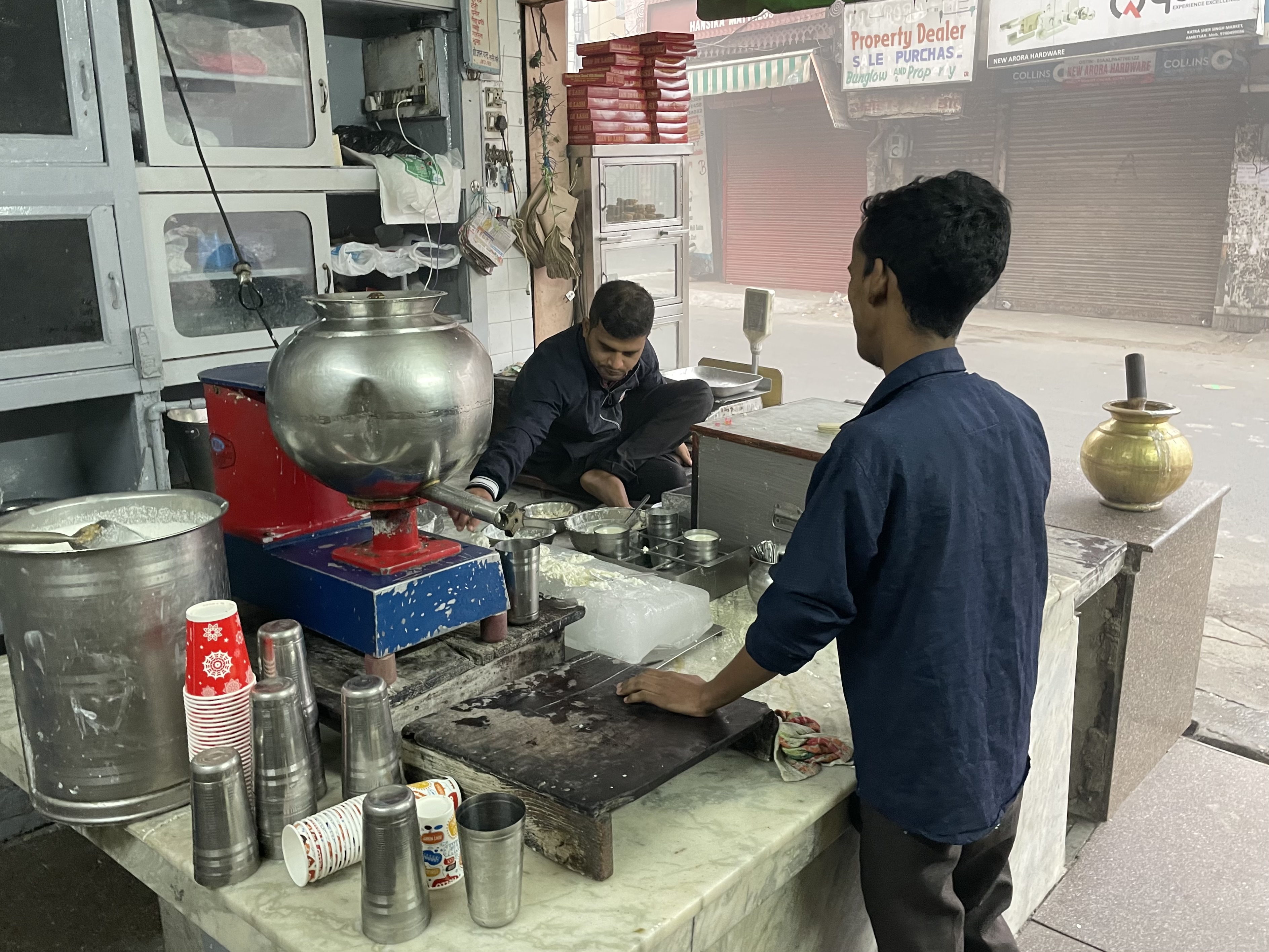 My next stop was Gian di Lassi, a 100-year-old lassi shop. Lassi is a yoghurt-based drink like a milkshake. Lassis originated in Punjab and Amritsar is known to have the best lassis in India. In the US, the vast majority of lassis are mango flavored but in India the most common flavor is “sweet” which is made with cardamom, rosewater, and saffron. “Salty” is another popular flavor.