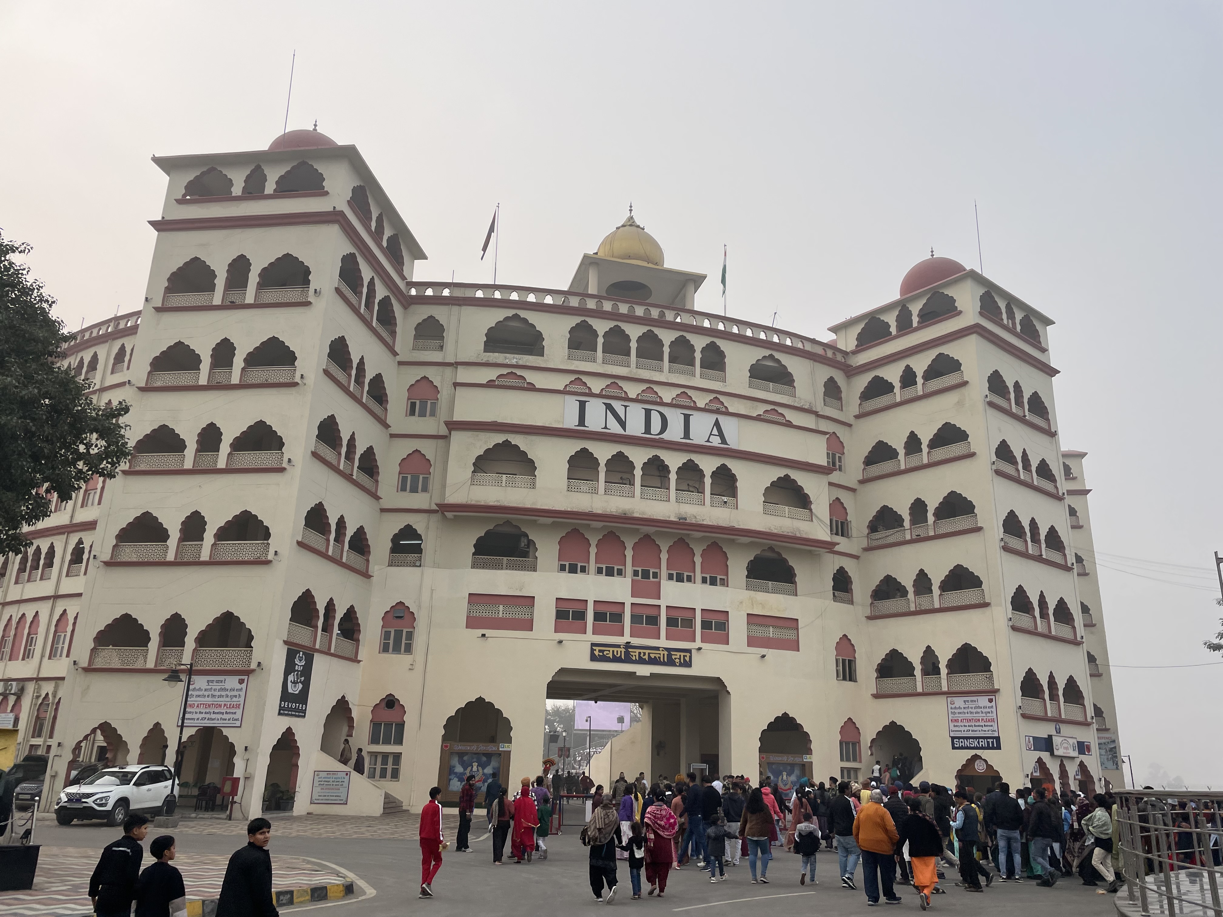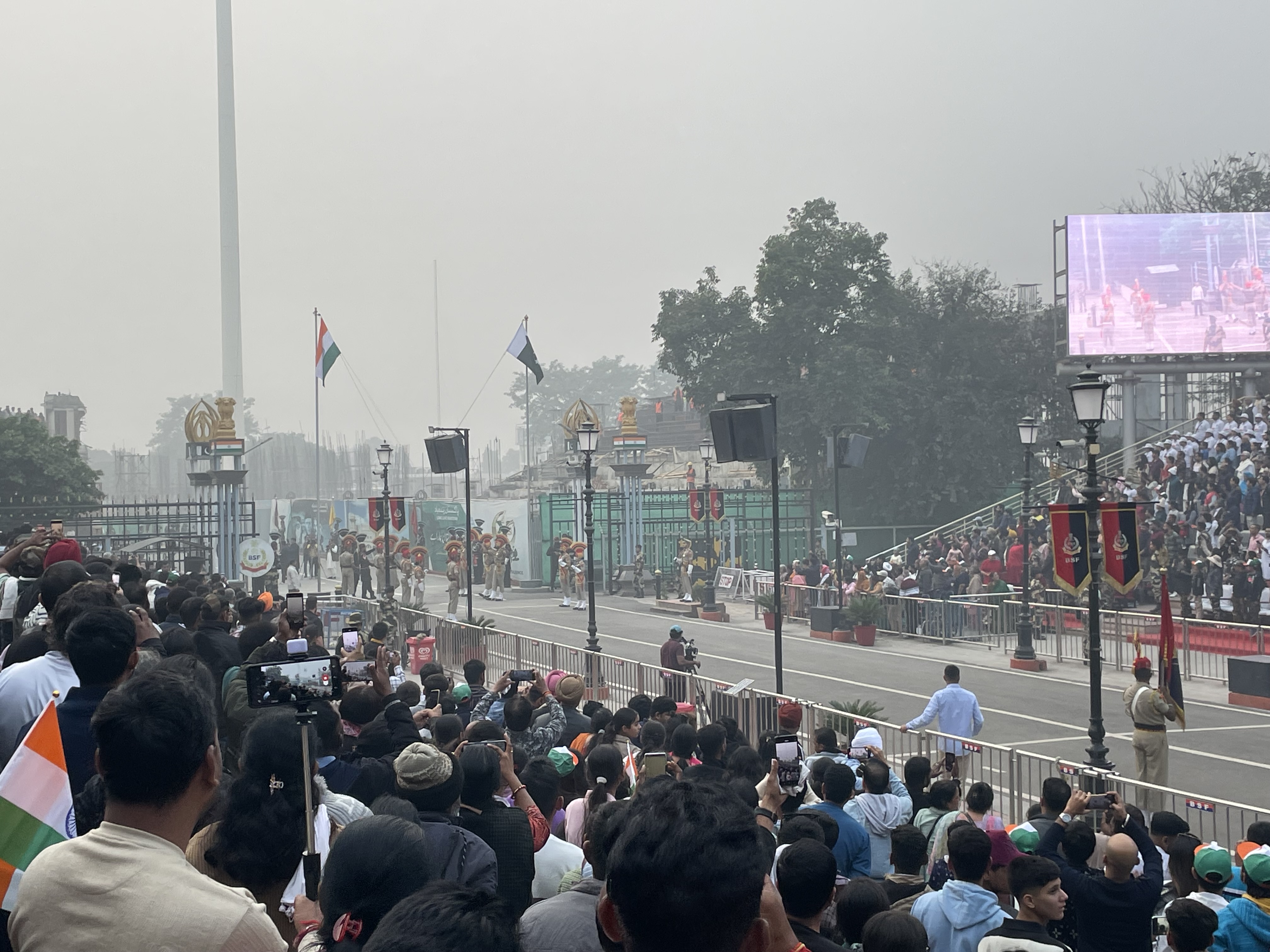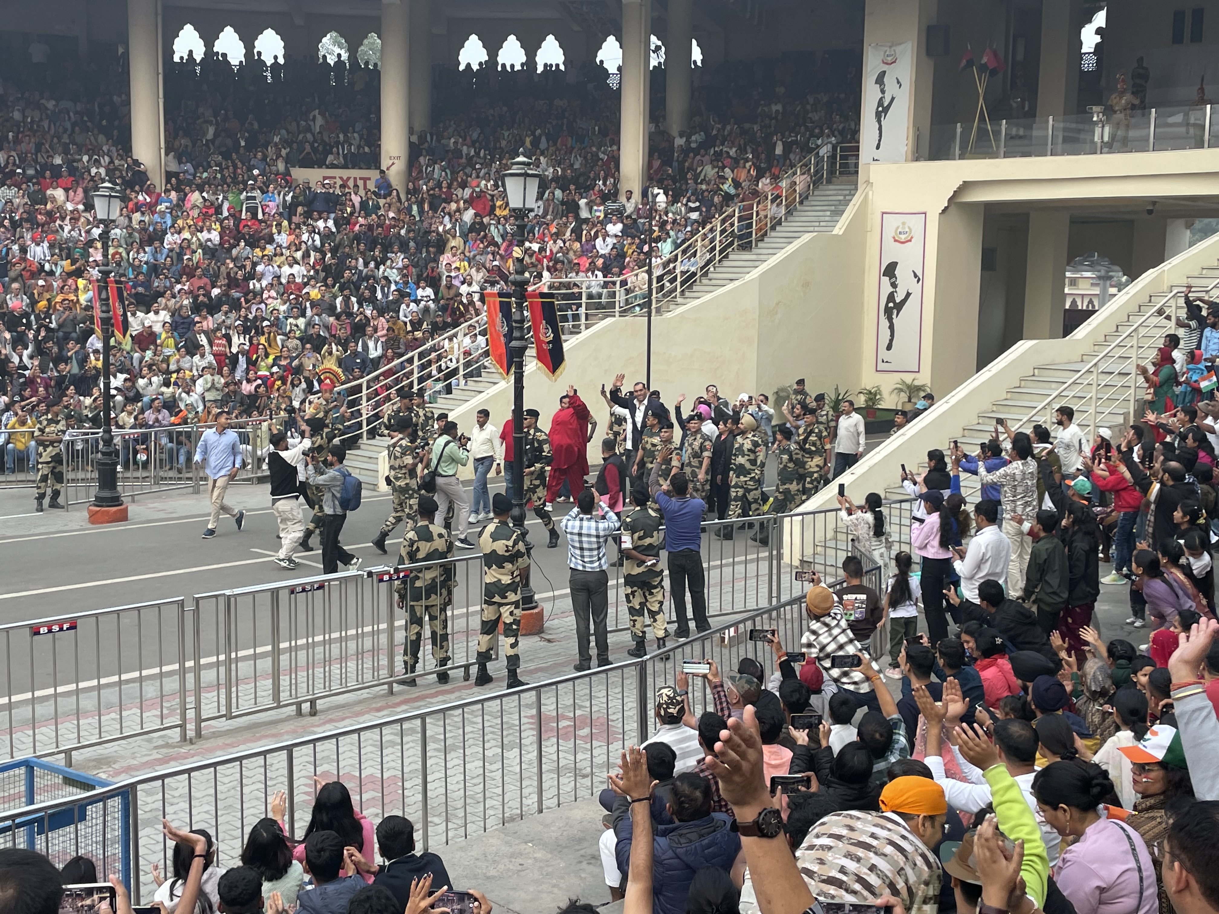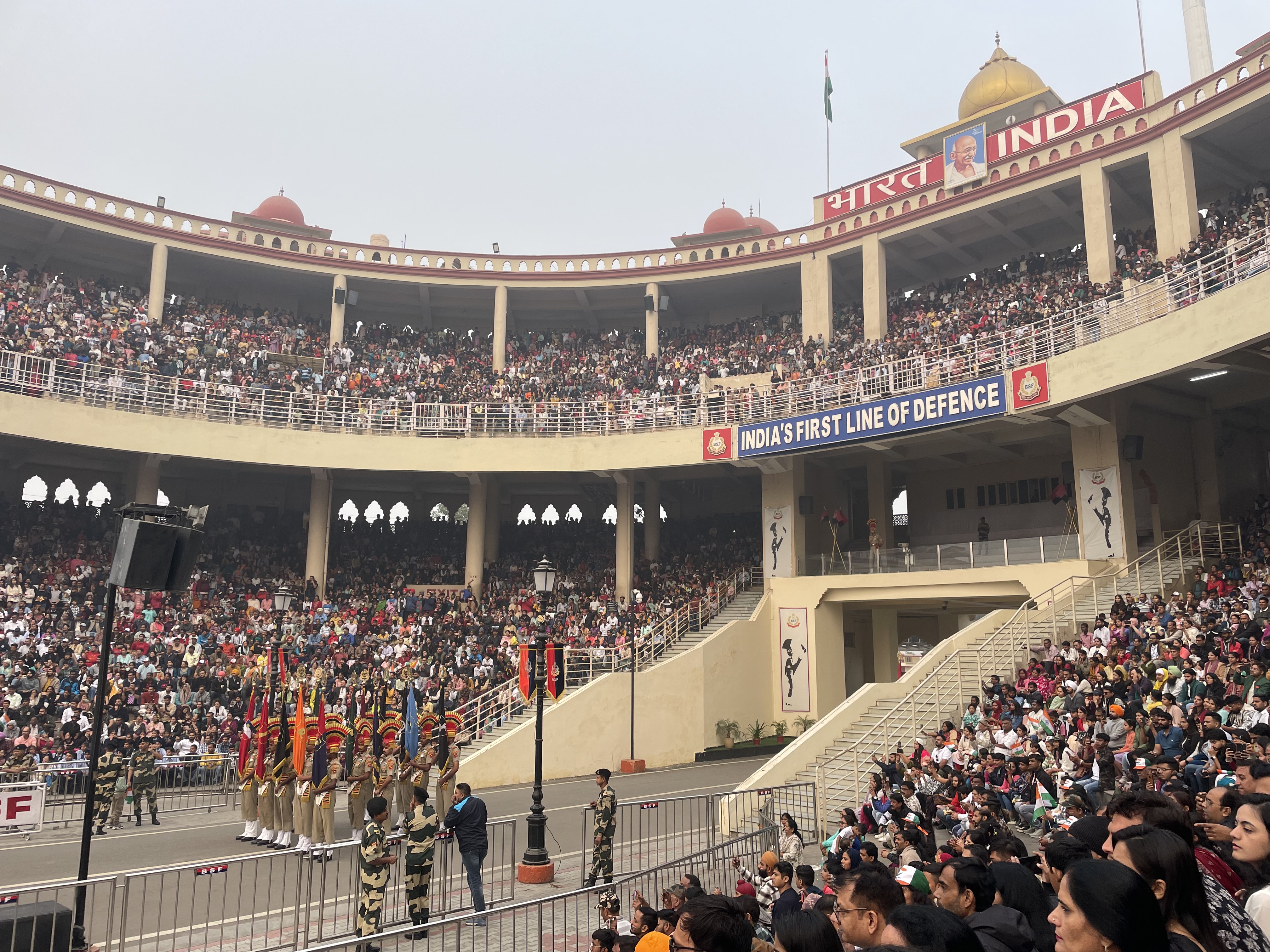To see the flag ceremony, we waited in a long line which included a thorough security search. We then entered the 25,000-seat stadium erected on the Indian side of the border. Pakistan was clearly visible beyond the border gate but their stadium. The crowd, decked out in India merch, was aroar! Bollywood music was blasting, and women were encouraged to dance (an apparent dig on the restrictions on women in Muslim Pakistan). The stadium quickly filled up to capacity.