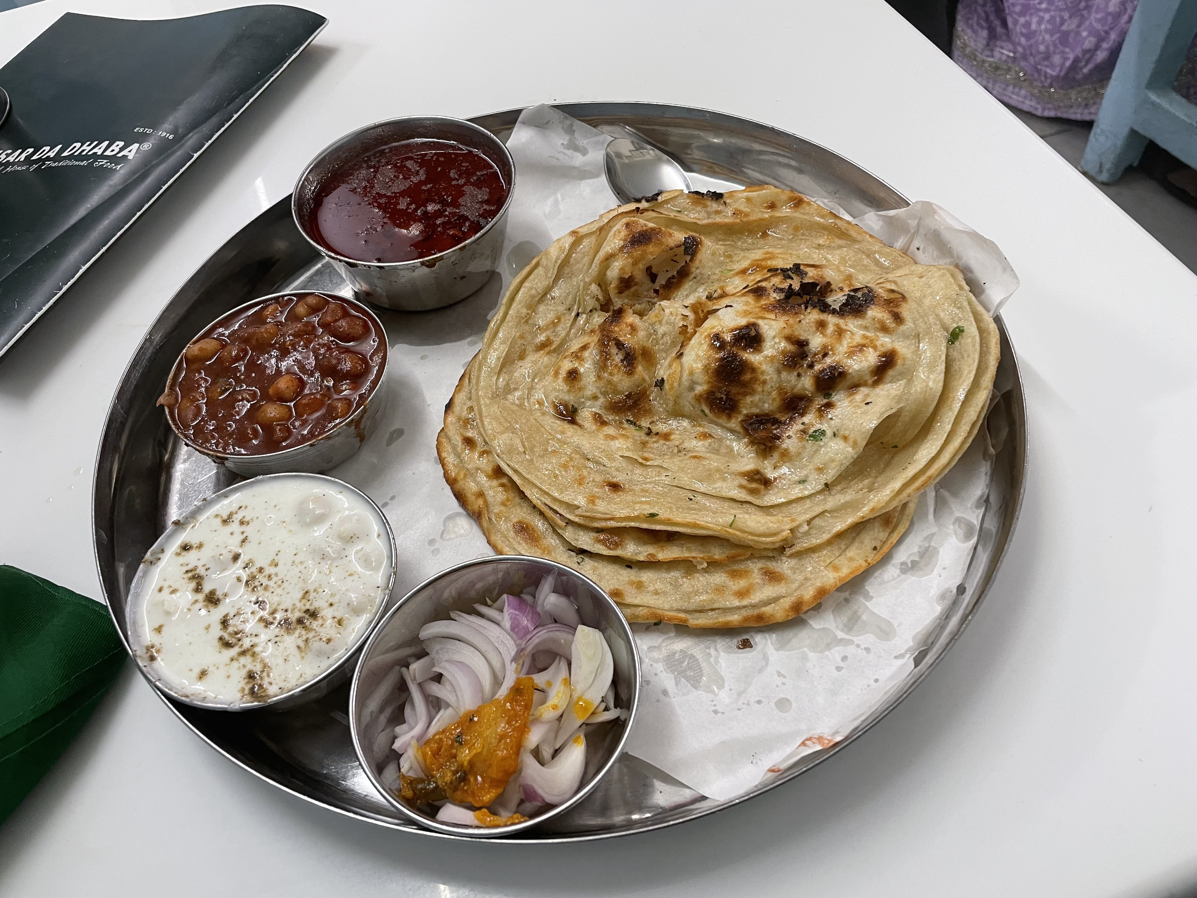 Back in Amritsar, I got back in time for dinner. Based on many recommendations, I went to Kesar Da Dhaba, a century-old vegetarian Punjabi restaurant in the middle of the maze. It was originally founded in pre-Partition Pakistan but moved to India during the Partition – apparently because many of the Indian revolutionary figures loved eating there so much. The signature dish was the dal makhani, but the hand-cracked paratha was also a star. Everything was doused in ghee!