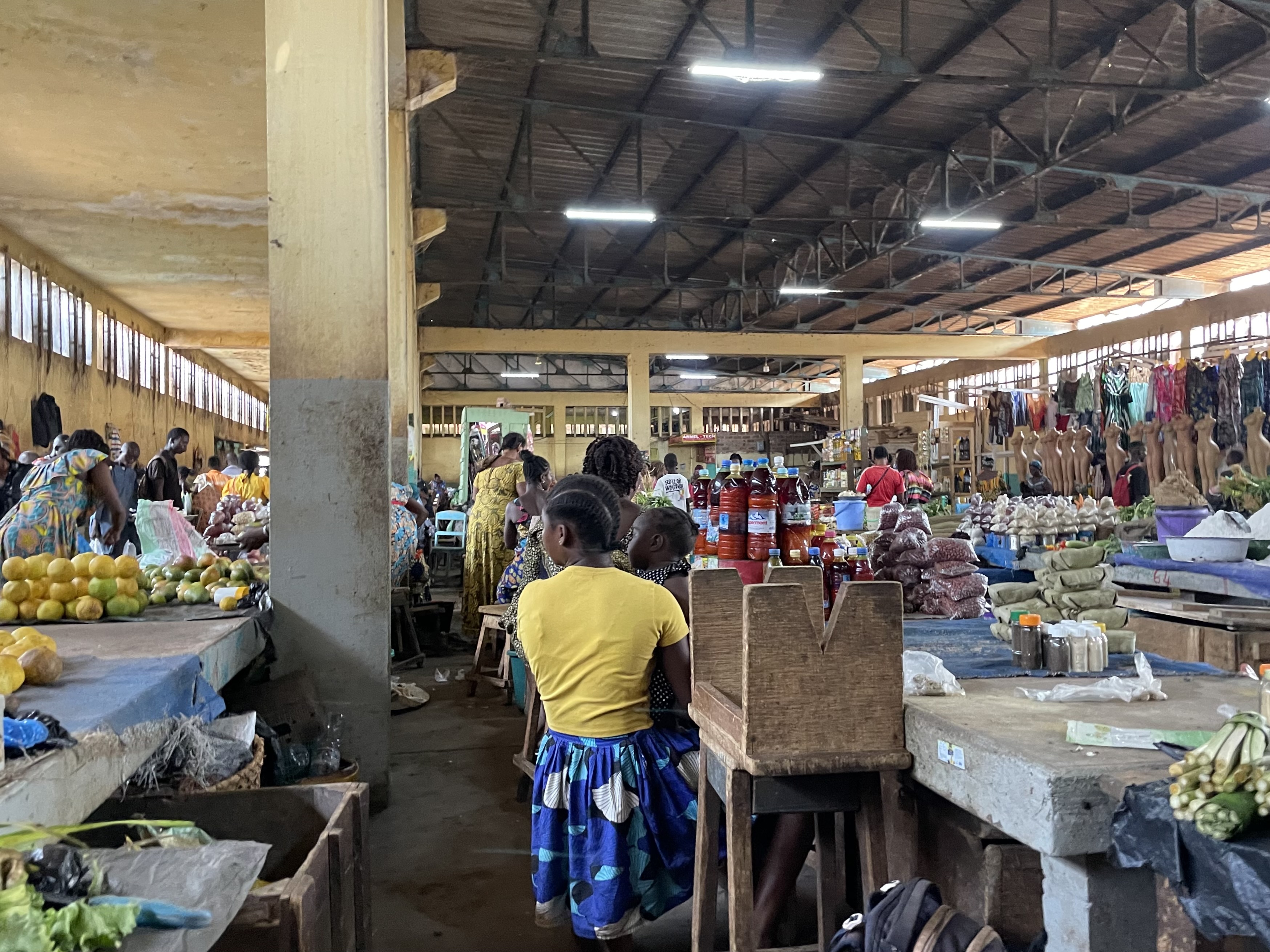 Finally, we visited the normal market. The inner building was mostly produce and some live chickens. The outskirts had clothing and some electronics. The market was busy, and the people mostly didn’t like getting photos taken – except the chicken vendors who asked us to take their photos.