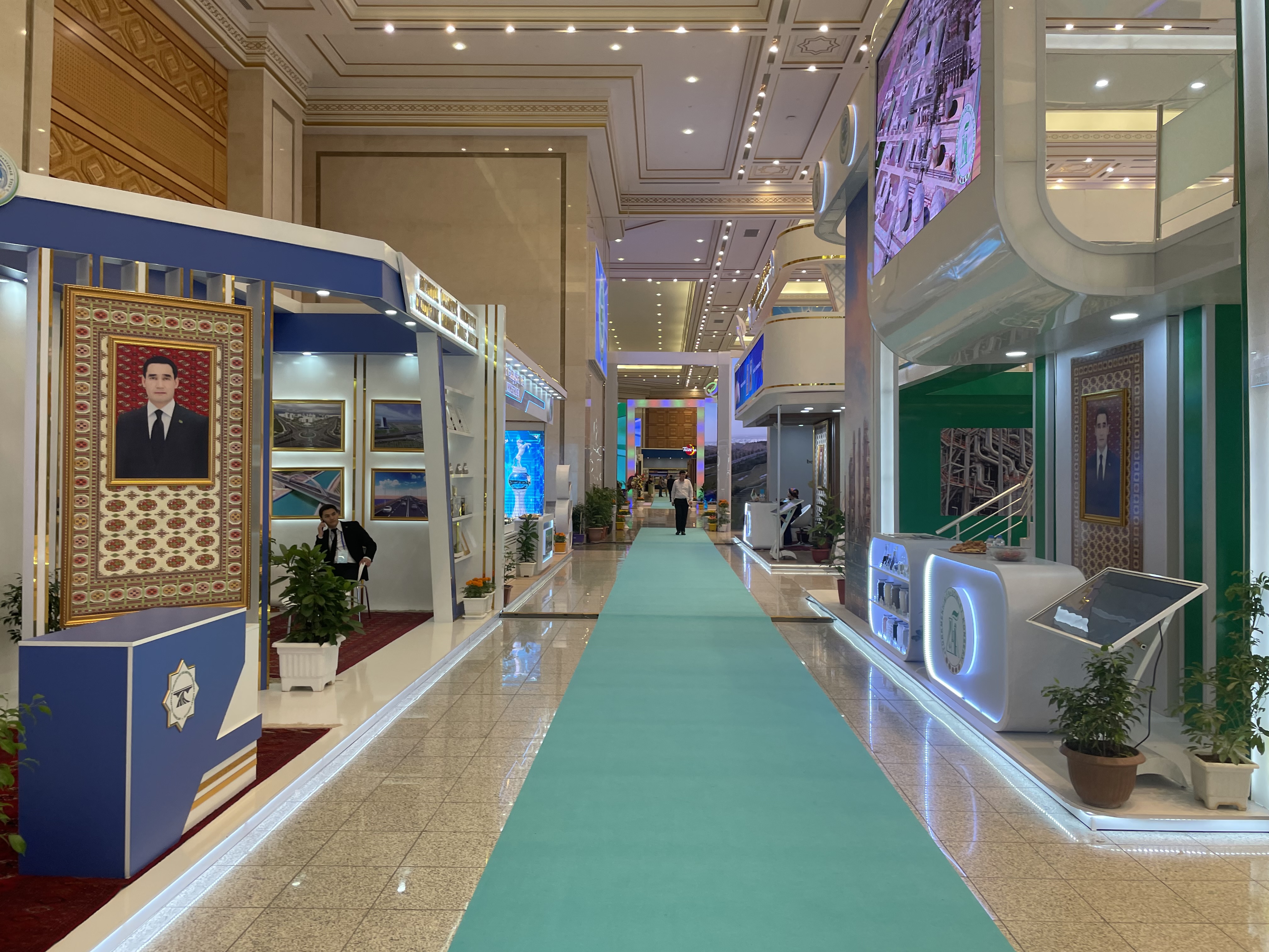On the bus, we learned that there is something going on at the Expo Center. Once there, we learned it was a convention and exposition for Ashgabat Day. Construction companies, food vendors, landscaping companies, motion simulator companies an even a traffic light company were all looking for big business deals to make Ashgabat the city of the future. Nearly every booth had a photo of the president.