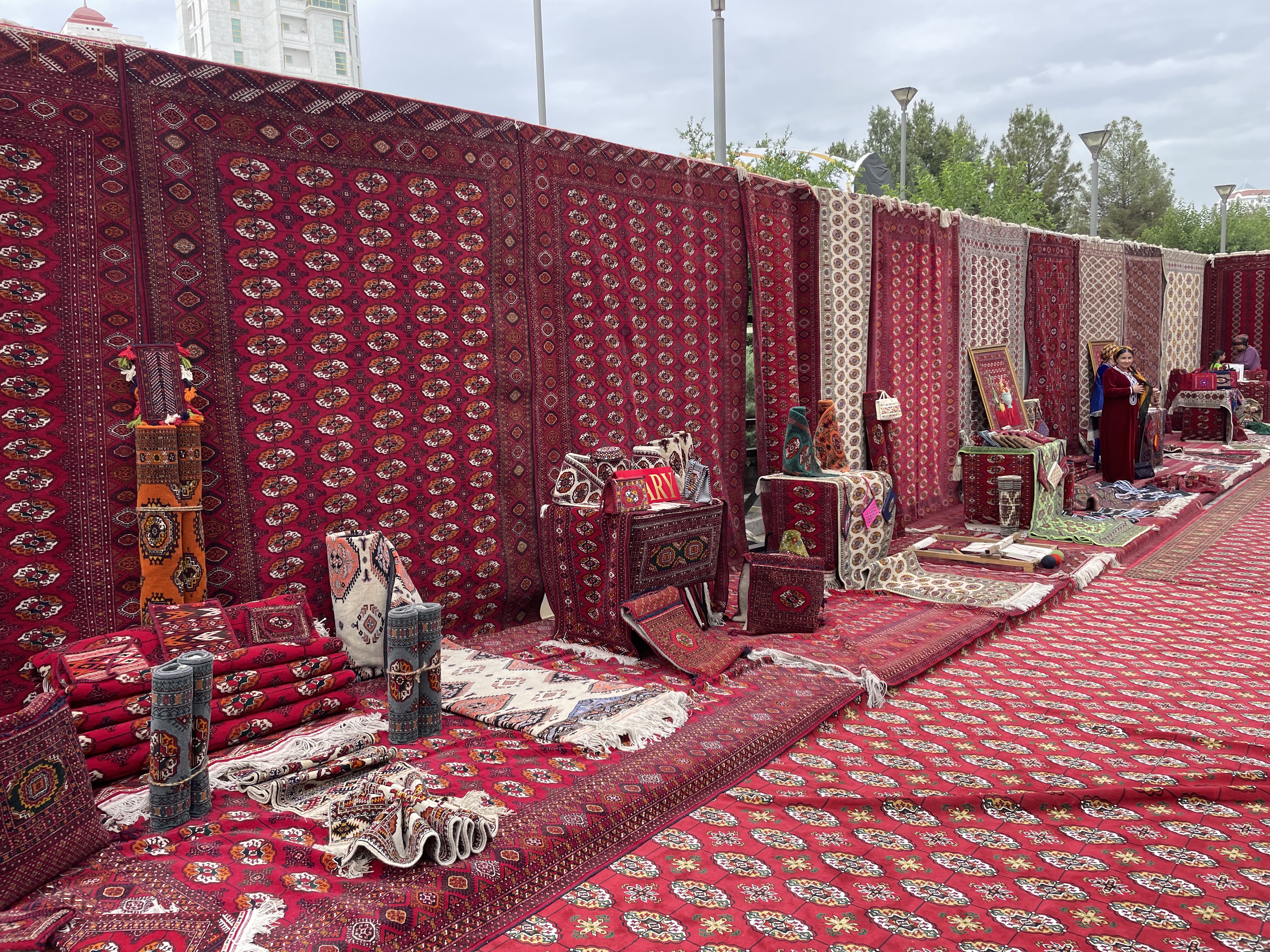 Next, we heard there was a celebration for Carpet Day at the Turkmen Carpet Museum. Once there, we headed to the back parking lot where there were tons of carpets on display. Vendors were selling goods (but not carpets because those are protected). There were also yurts with women teaching traditional crafts.