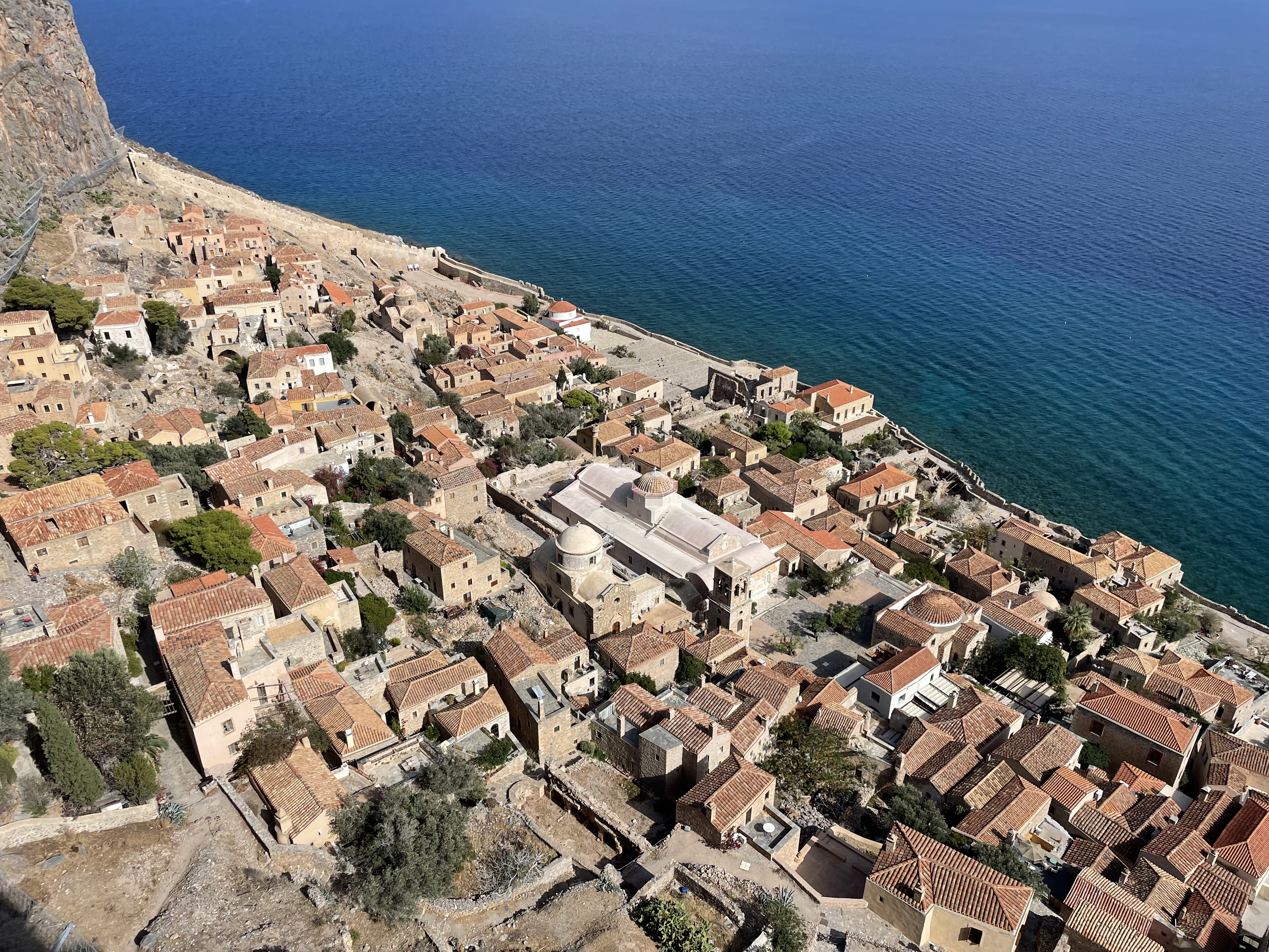I then drove 90 minutes southeast to the coastal town of Monemvasia. Monemvasia is a medieval walled city that came to prominence during the Byzantine era. The city is set located on mountainous rocky island barely connected to the mainland by a sand spit. Like Mystras, Momenvasia has both an upper and lower town. The lower town is on the coastal slope of the rock while the upper town in on top of the rock. Due to its strong defenses and similar setup, Monemvasia was long considered the Gibraltar of the East.