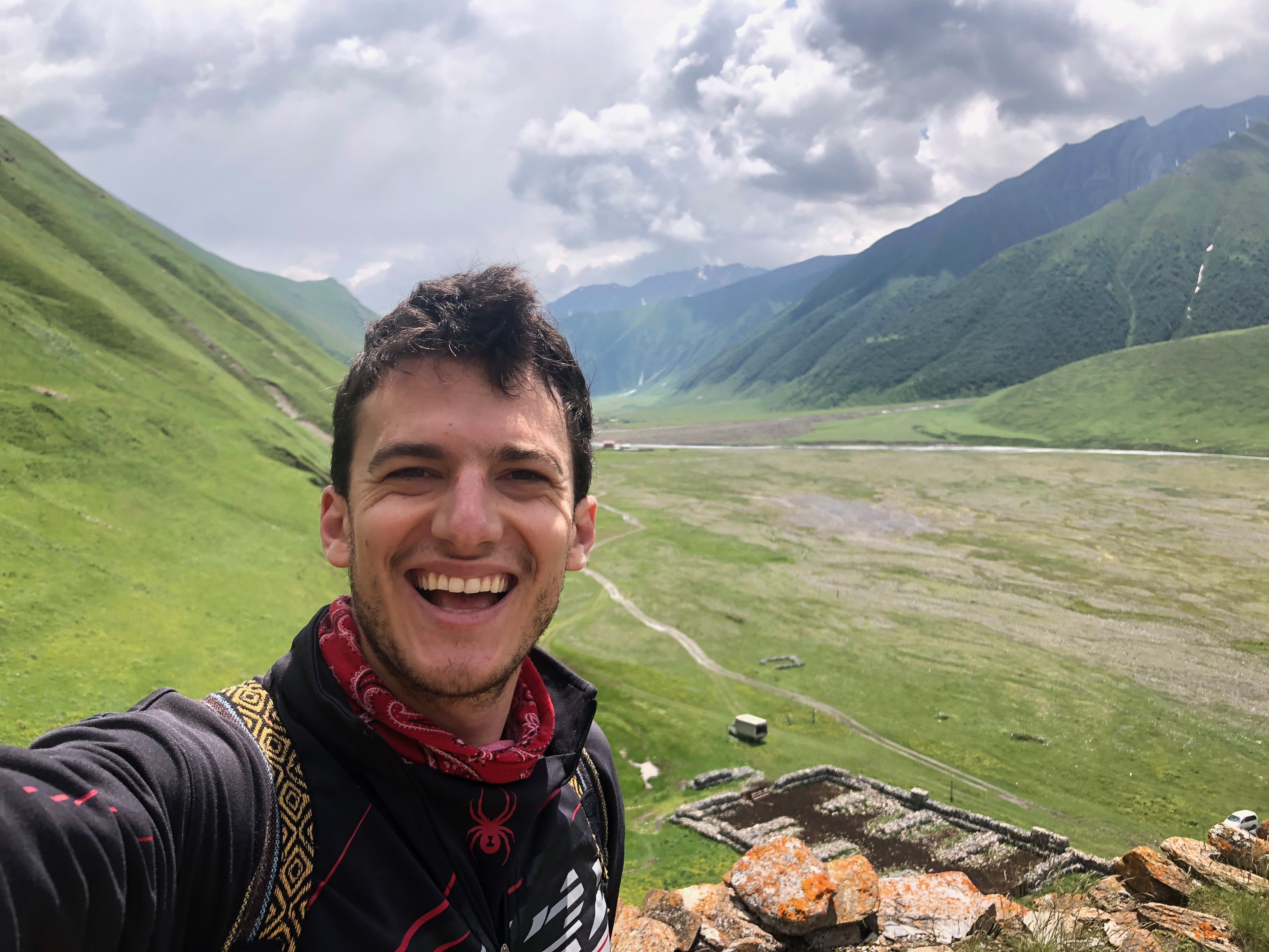 With a full belly, I embarked on a hike to the famed monastery on the lower slopes of Mount Kazbek. The hike up took an hour of steep uphill. Just before the top I ran into a group of 3 horses. They were very interested in my bread and were pushing up against me to get it. I got a few selfies with them and even got another tourist to take pictures of me with the horses. Eventually the horses got more aggressive and I was a bit scared, so I threw a piece of bread as far as I could, which got the horses to run away from me. I then walked the rest of the way to the monastery.