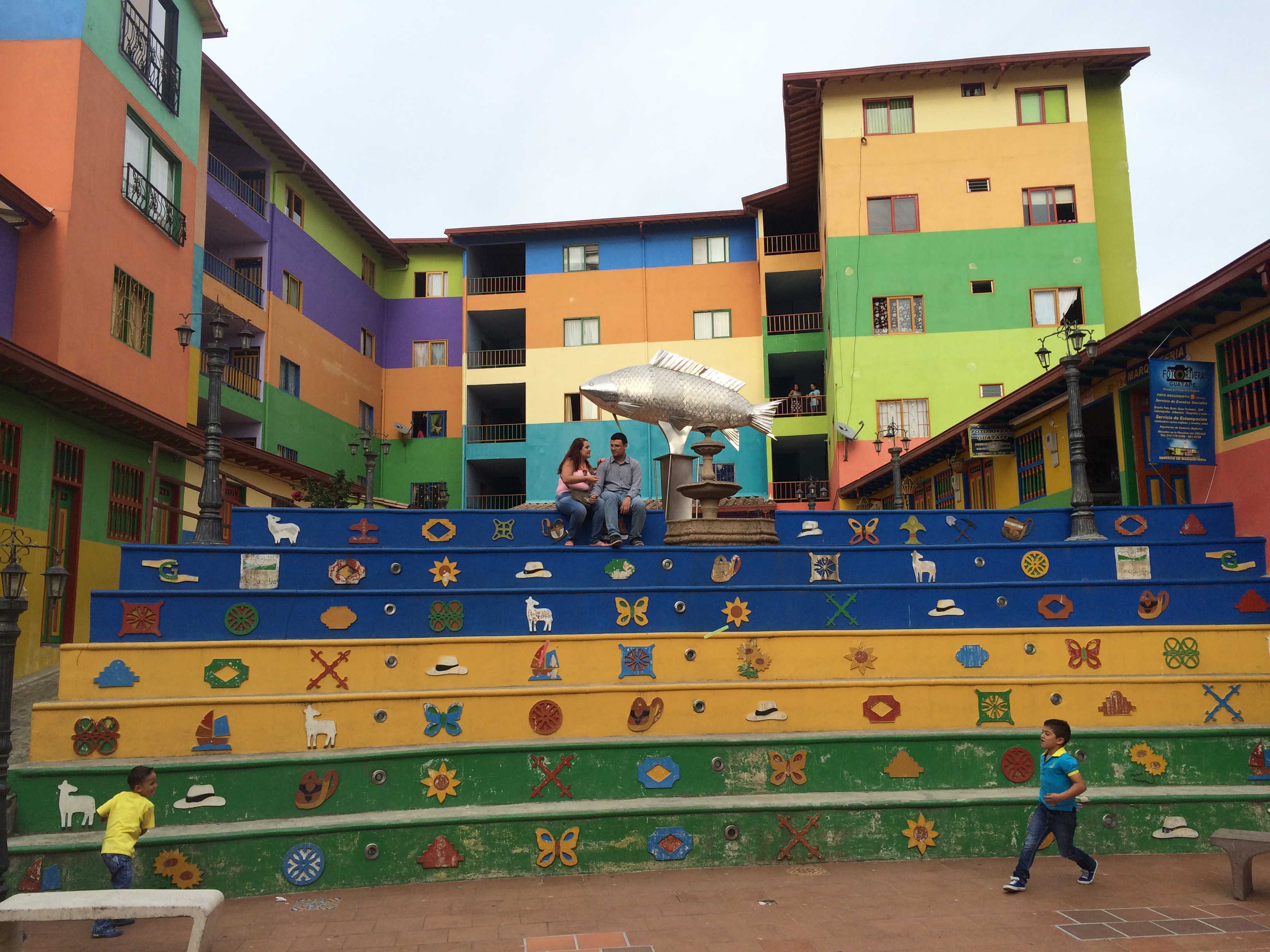 Hopping back into the van, we drove to the town of Guatape. It was a beautiful small colonial town with more colors than anywhere I’ve ever seen. Every house and building had colorful murals. There was a small square that was completely rainbowed out. Even the rickshaws and busses were colorful. The town was hopping with visitors and locals alike. Besides the colorful buildings, the town set up a zipline going along the lakeshore. Music was bumping. It just seemed like a very happy place to be.