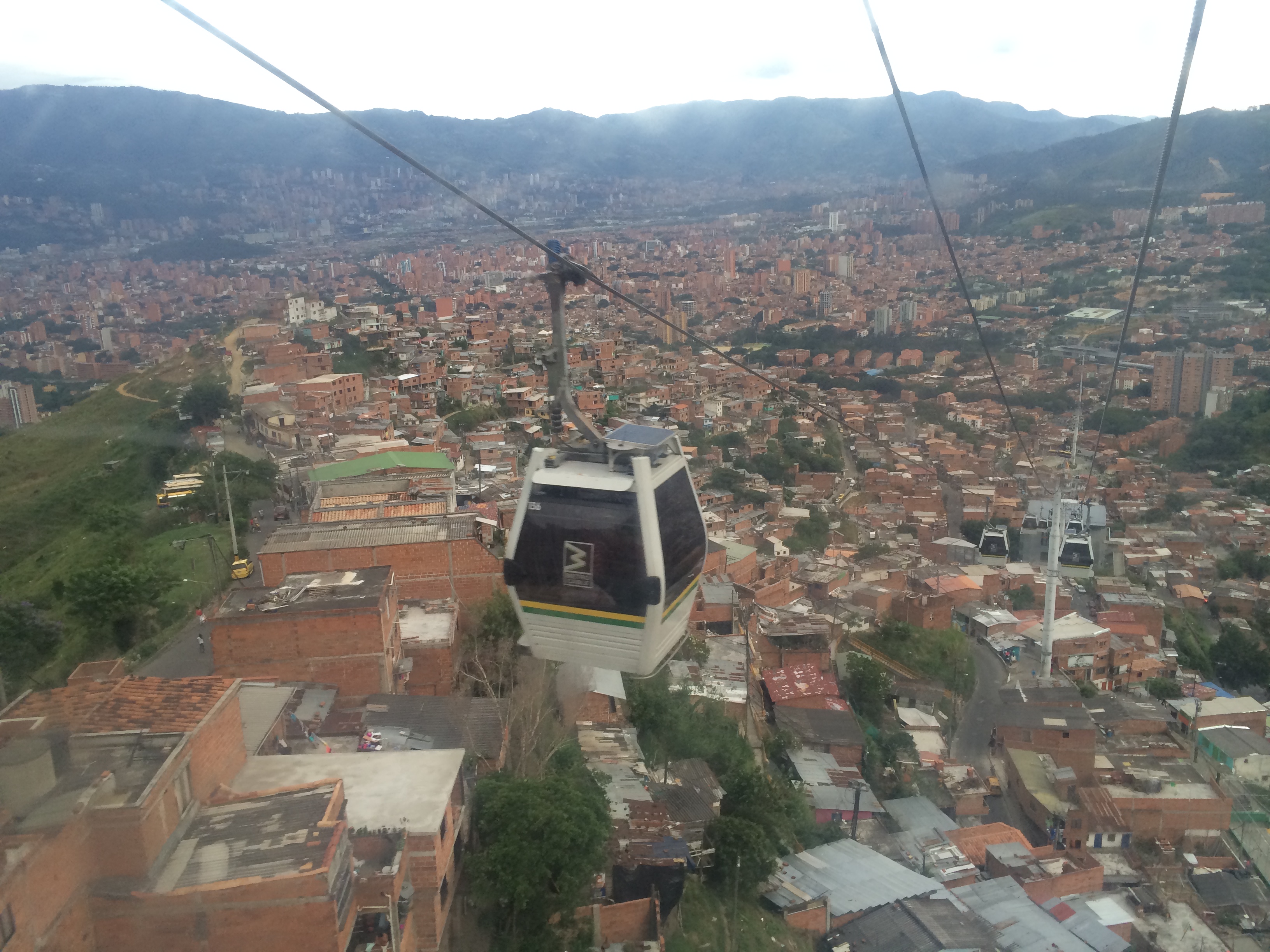 I boarded the gondola with 6 other Colombians who were waiting in line. For the length of the trip through the 4 stations, we were all silent. However the neighborhoods we flew over were anything but. We heard loud reggeton, chickens, children playing and life happening. The houses were decrepit poorly built structures with corrugated steel roofs topped with large stones to hold them in place.
