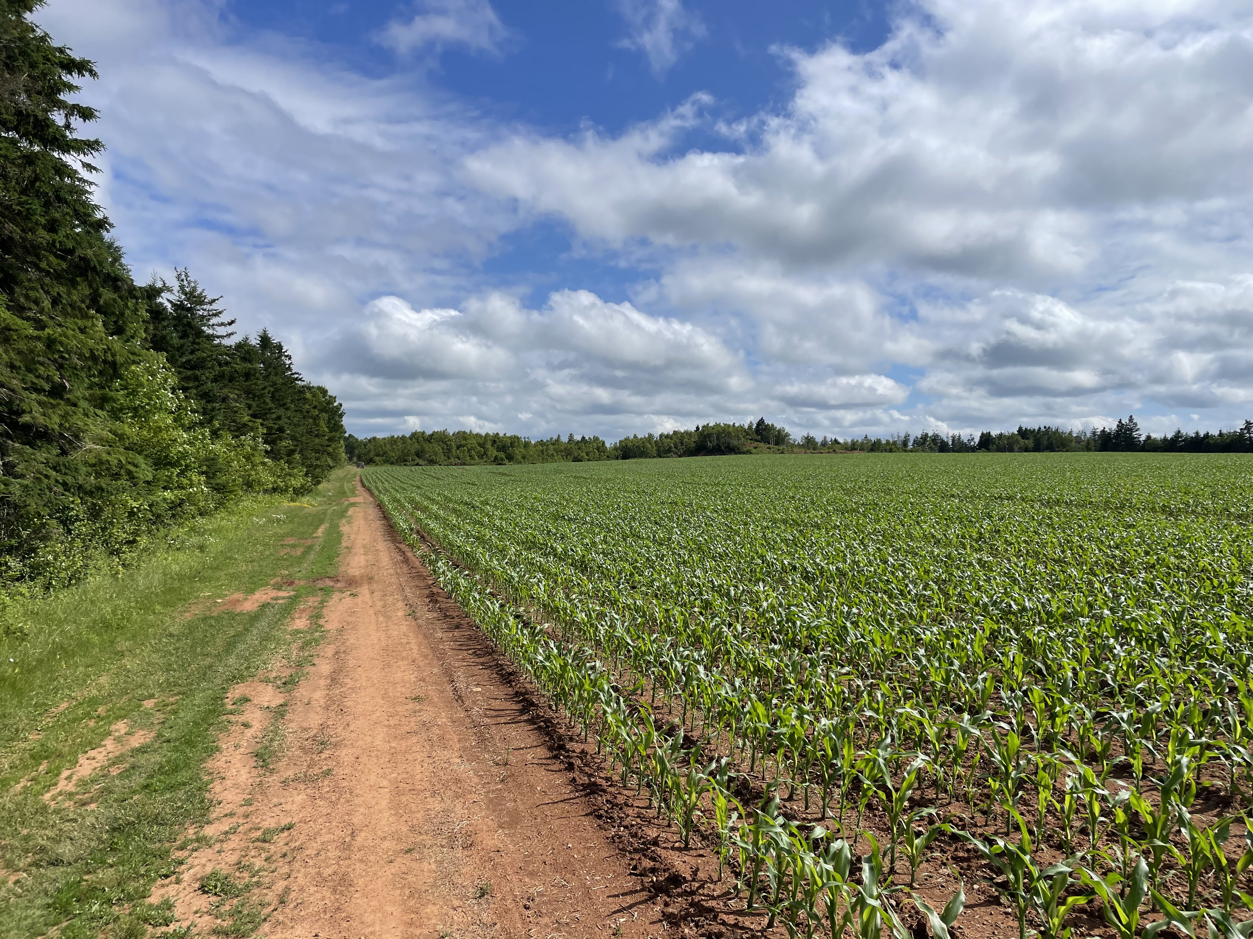 The PEI high point is unnamed and is in the woods near a potato field. To reach it, I drove about 20 minutes south of Cavendish, the final stretch was on a red dirt road.