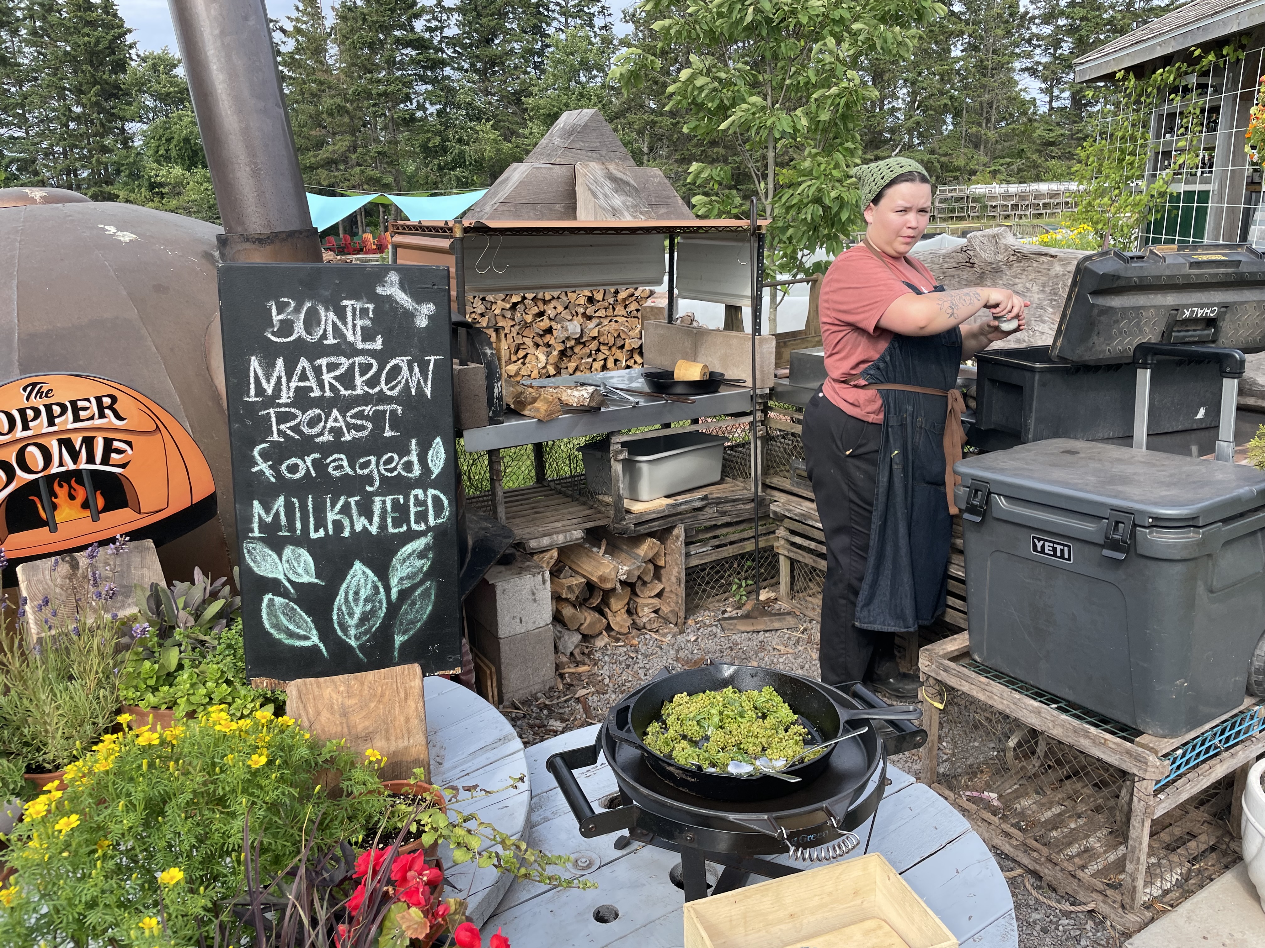 Finally, it was time to start eating. The appetizers were served at purpose-built outdoor stations behind the garden. The stations included: three types of PEI oysters including the oysters farmed in the bay in front of the hotel, foraged milkweed cooked in bone marrow, pork tacos with tortillas made with fat from last year’s pigs served in a shack blasting country music, smoked salmon, roasted oysters with lovage butter, pork belly, and kohlrabi. To drink, I had a rhubarb lemonade with local gin and hard cider made from their own apples.