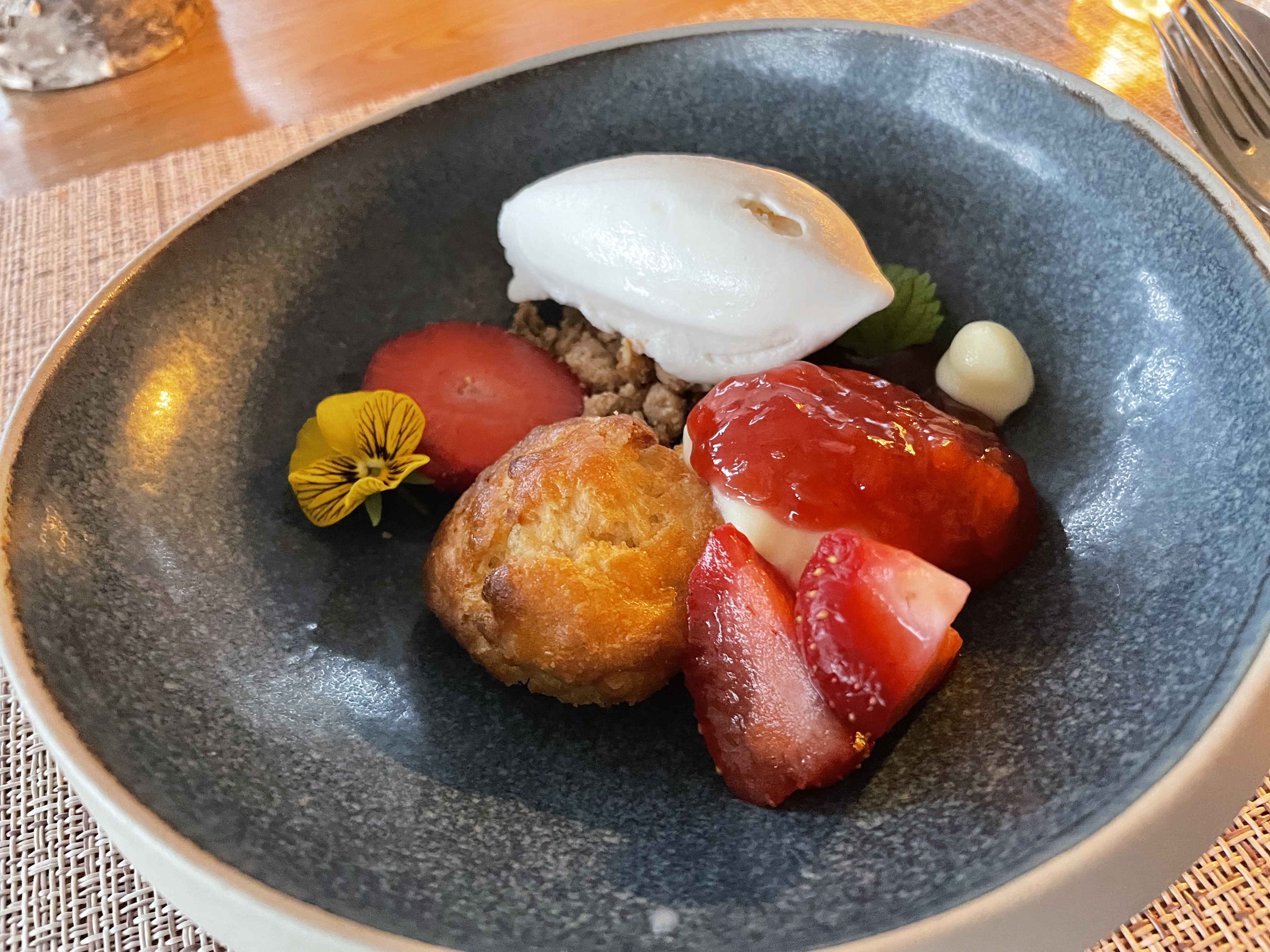 Finally for dessert, we ate a strawberry shortcake with rose ice cream and marshmallows.