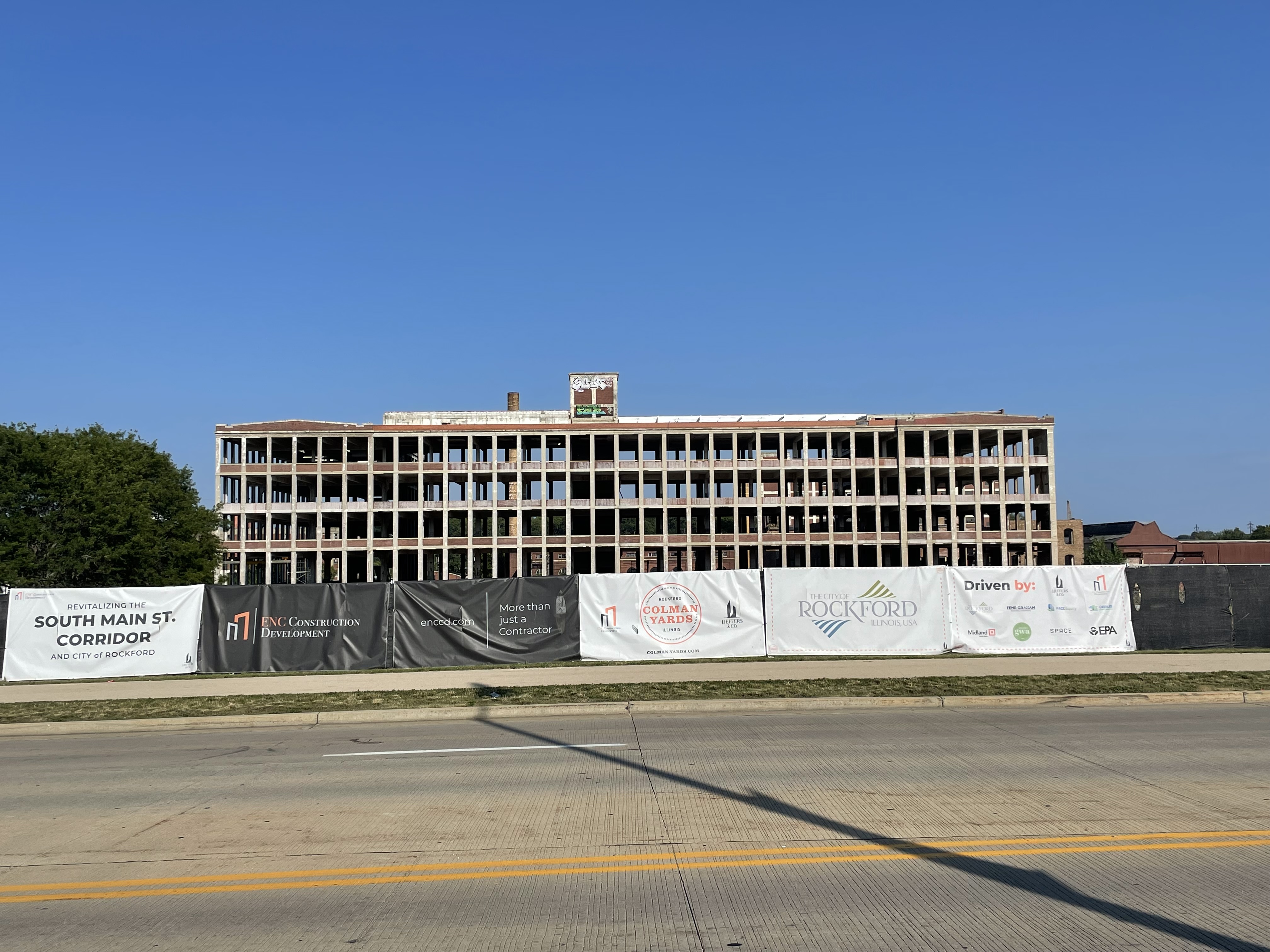 The walk started along the sidewalk. Just outside of downtown, I ran into some abandoned commercial areas but also a huge renovation of a gigantic school-sized complex.