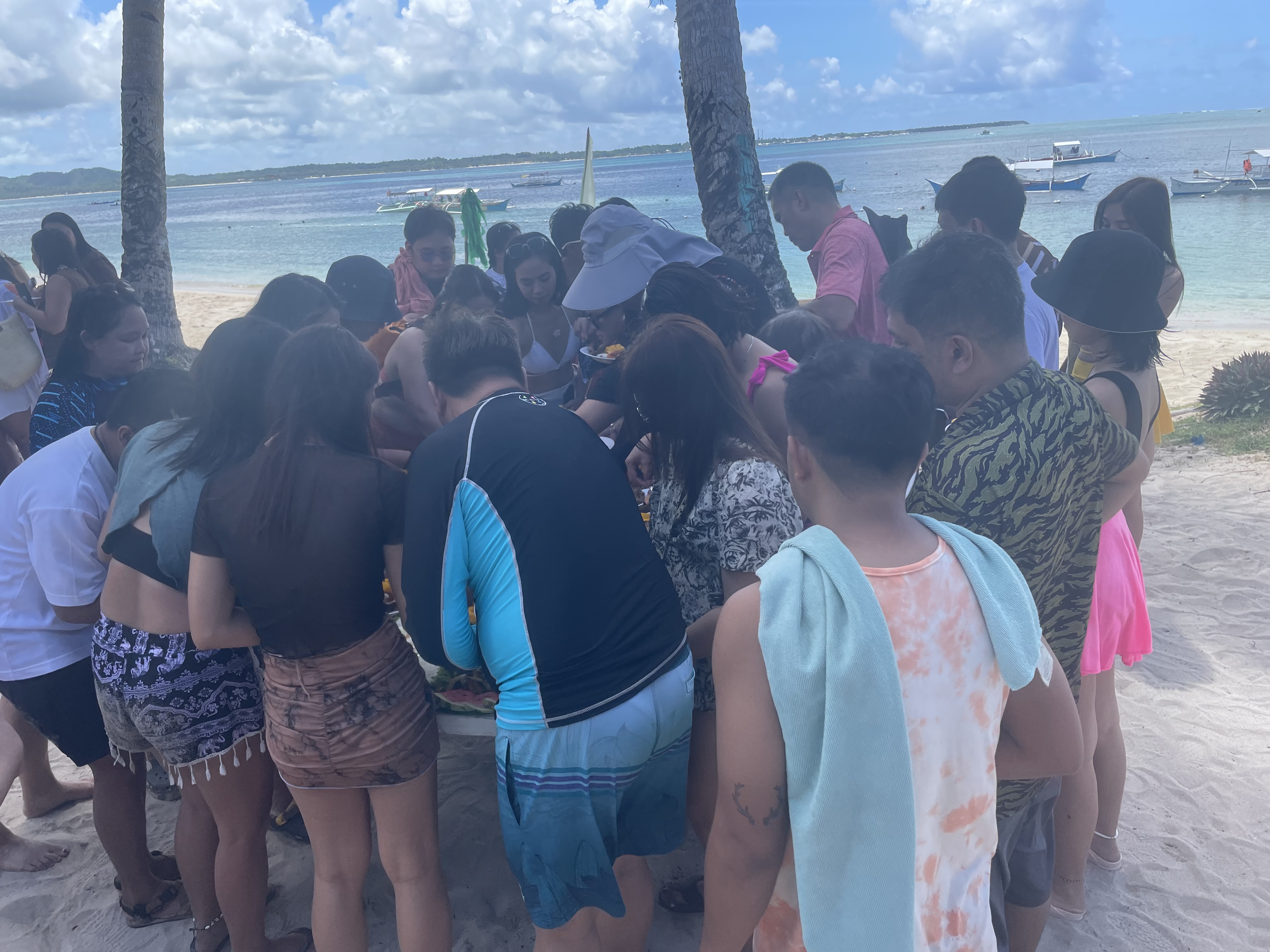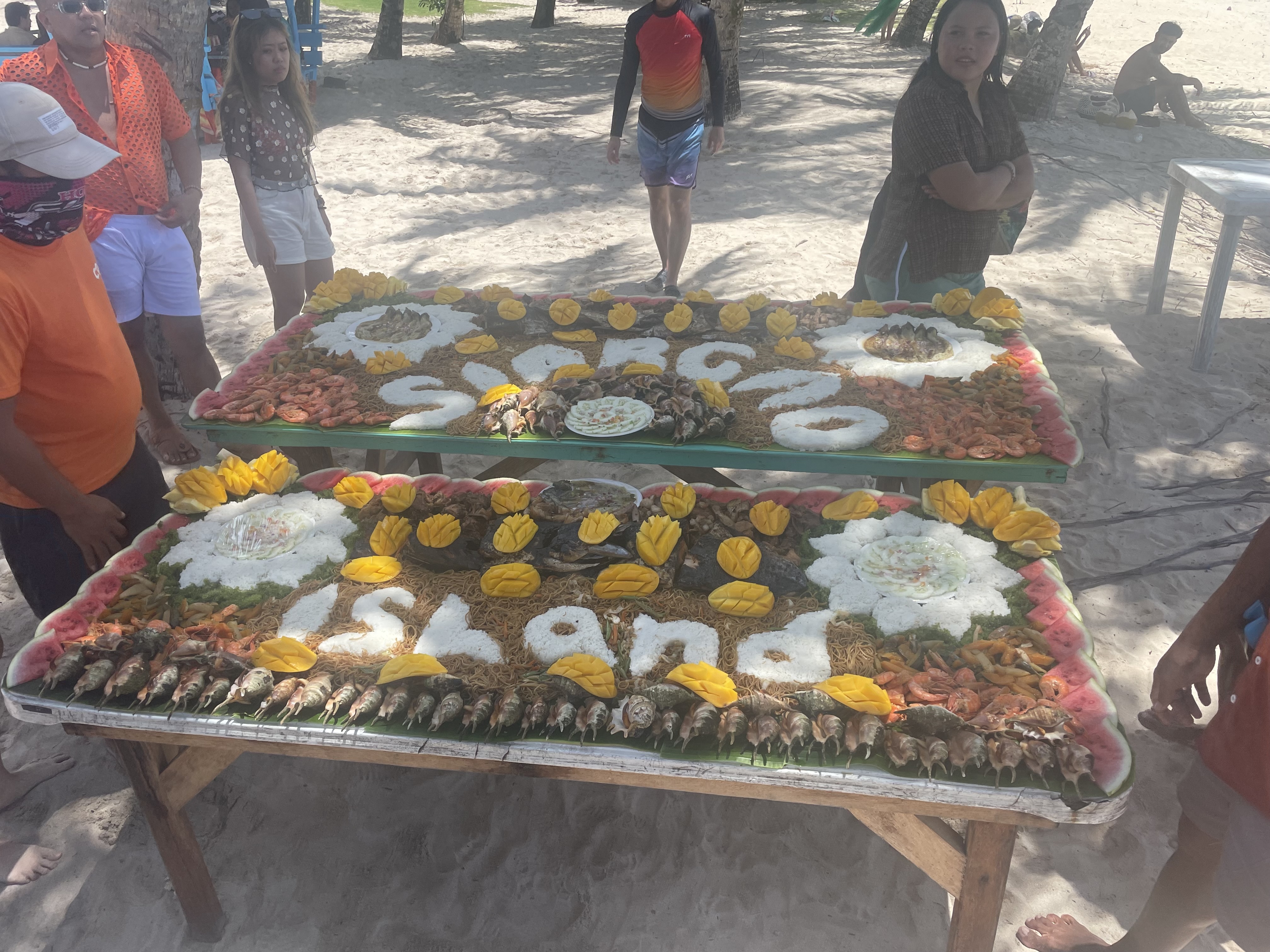 After an hour on the beach, our boodle fight lunch was ready. Boodle Fight is a Filipino tradition stems from the army which adopted it from a United States Military Academy at West Point tradition to build camaraderie. Today boodle fights are very common for large parties, special events or group dinner. The food, in this case a huge grilled fish, rice, noodles, seafood and fruit, was placed on large banana leaves. At the correct moment, it became a free for all with everybody grabbing the food with their hands.