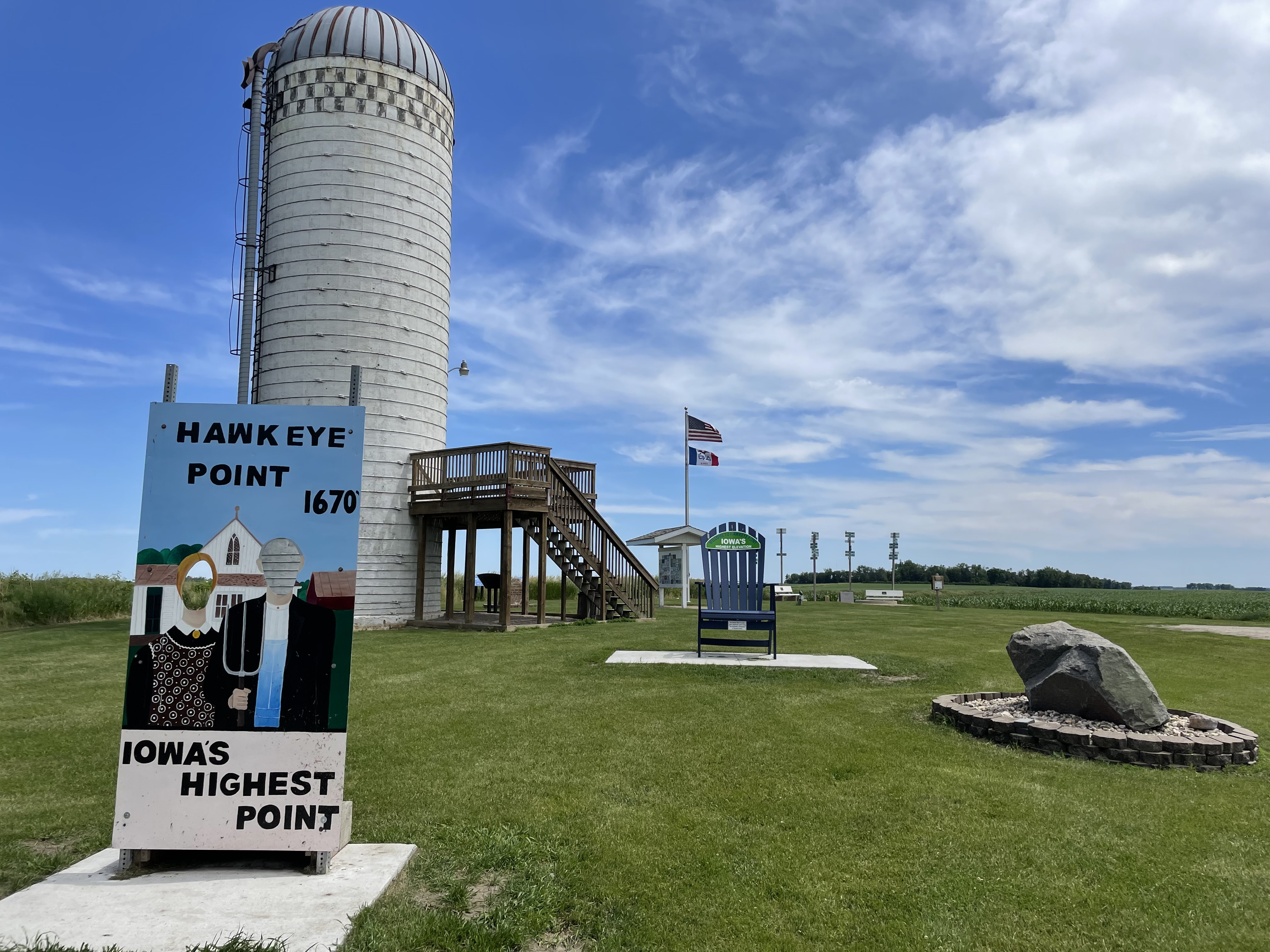Despite the meager location, the county went all out on visitor amenities. There is a summit register, multiple plaques, distance markers to all the other state high points, a giant chair, a grain elevator, historic barn, American Gothic wooden photo op and museum of historic farm equipment! Truly, what more could you want?!